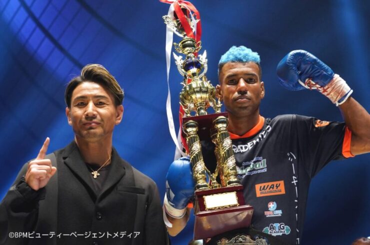 11⽉15⽇(土)、国⽴代々⽊競技場 第⼀体育館にて「K-1 WORLD MAX 2025」が開催された。第17試合メインイベントでは、K-1 WORLD MAX 2025 -70kgトーナメント・決勝戦が行われ、ジョナス・サルシチャ(ブラジル)がダリル・フェルドンク(オランダ)を破り、トーナメントを制した。 K-1 WORLD MAX 2025 -70kgトーナメント・決勝戦/3分3R・延長1R 〇 ジョナス・サルシチャ(TF Team/CT Allan Popeye) VS ダリル・フェルドンク(Fight Team Ringer) KO(1R /2分30秒) 準々決勝でオウヤン・フェン(中国)を3-0の判定で、準決勝でジョナサン・アイウル(サモア)に1R KOで決勝に駒を進めたジョナス・サルシチャ(ブラジル)は、同じく準々決勝でアルフォセヌー・カマラ(セネガル)を延長1R判定で、準決勝でストーヤン・コプリヴレンスキー(ブルガリア)を3R KOで下して決勝進出を決めたダリル・フェルドンク(オランダ)と対戦。サルシチャが長く険しい激戦トーナメントを制した。 1R、サルシチャは飛びヒザ蹴りや左フック、ヒザ蹴りなど多彩な攻撃で圧力をかけると、右パンチの連打から三日月蹴りをボディに突き刺しダウンを奪取。立ち上がったフェルドンクにも再び強烈な三日月蹴りを放ち、KO勝利でトーナメントを制した。 サルシチャは「優勝することが、小さい頃からの夢でした。長く王者でいられるよう、これからも頑張ります。本当に嬉しいです。ブラジルのみなさん、そして日本にいるブラジルの方々からの応援を受け、感謝の気持ちでいっぱいです。ありがとうございました。次は、オウヤンのベルトを奪いにいきたい」と次なる目標を口にした。 K-1プロデューサーの須藤元気氏は試合後、「サルシチャ選手の、70kgで191cmって、なかなか懐に入ることが難しいんだなと思いましたし、セーム・シュルト(オランダ)を思い出しましたね。サルチャ選手がクレバーだなと思ったのは、準決勝で一気に畳み込んで勝利し体力を温存したところですね。フェルドンク選手が近い距離での打ち合いが強いことを分かっていたので、前蹴りなどで距離をとったり、巧妙な駆け引きが観られた試合だった。また、フェルドンク選手は準決勝で、鼻が骨折して、頭も負傷している状態にもかかわらず、決勝のリングに上がる姿をみて、ここまでタフな選手が今までいたかなと思わせてくれるくらい頑張った選手なので、 『元気賞』をあげたいな」と振り返った。
