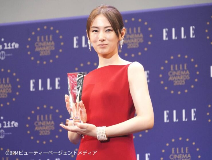 ELLE CINEMA AWARDS 2025 の授賞式が12月10日(水)、都内にて開催された。映画『ナイトフラワー』でエル ベストアクトレス賞に選ばれた北川景子は、「デビューして22年になりますが、主演で映画賞をいただくのは初めてで、本当に嬉しいです。トロフィーの重みをずっしりと感じています」と喜びを語った。 北川景子さんは受賞の喜びを、次のように語った。「デビューして22年になりますが、主演で映画賞をいただくのは初めてで、本当に嬉しいです。トロフィーの重みをずっしりと感じています。このような賞をもたらしてくださった内田英治監督、そして内田組の皆さんに、改めて心より感謝申し上げます。」 また、『ナイトフラワー』が自身にとってどのような作品になったか問われると、「この作品のお話をいただいたとき、相当な覚悟を持って挑まなければと思いました。これまでの経験や自分の能力も一度すべて横に置いて、魂を込めて、全身全霊でぶつかっていこうという気持ちで演じました。完成した映画を観て、私の想いがスクリーンを通して少しでも皆さんに伝わったのかなと思える瞬間があり、頑張ってよかったなと感じました。」と振り返った。 北川さんは、2025年を振り返る印象的な出来事についても語ってくれた。「2025年は母親役を演じる機会が多く、子どもとの関係を改めて考えさせられる一年でした。朝ドラの中で“お金を恵んでください”というシーンがあったのですが、娘がそのシーンを見て、『ママ、そんなにお金なかったの?』と言ったんですね。本当のことだと勘違いしてしまうほど伝わる芝居ができたことは嬉しい反面、娘を心配させてしまったことに複雑な気持ちにもなりました。 娘には響きすぎてしまったらしく、『もうお洋服買えないの?』とまで言われてしまって」と、北川さんはエピソードを語った。 2026年については、「重い役が続いていたので、そろそろ幸せな役をやりたいですね」と笑いを誘い、「時々キラキラしたいですし、幸せで楽しい役にも挑戦したいと思っています。健康に気をつけながら、家庭に軸足を置きつつ、充実した生活を送りたいです。」と今後の展望を語った。 北川景子、吉沢亮ら豪華受賞者が集結【ELLE CINEMA AWARDS 2025】